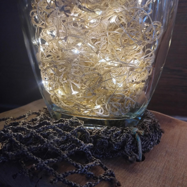 Unsere dekorativen Ghostnet Bottles bestehen aus den schönsten Whiskey- Rum- oder Gin Flaschen. Auf einem alten Eichenbrett platziert und mit Geisternetz und LED-Lichterkette befüllt und verziert ist die Bottle ein wahrer Hingucker. Die warm weiße LED-Kette verfügt über eine Fernbedienung mit 8 verschiedenen Lichtmodi's sowie einer Timerfunktion. Angeschlossen wird die Ghostnet Bottle an einem herkömmlichen USB-Netzstecker (Bitte habt Verständnis, dass wir den USB-Netzstecker nicht mitliefern. Jeder hat mittlerweile so viele von diesen Elektroschrott unbenutzt zu Hause herumliegen und wir möchten nicht unnötig noch mehr Müll produzieren. Danke)