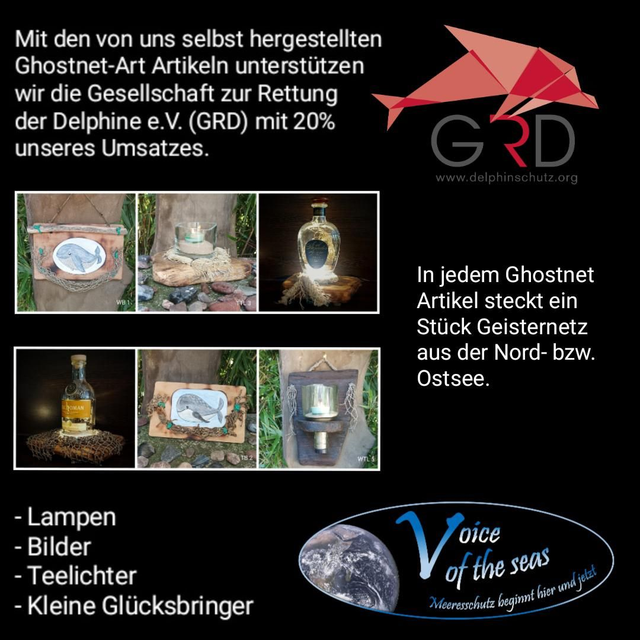 In jedem unserer selbst kreierten Ghostnet Art Bildern ist ein Stück Geisternetz verarbeitet und dadurch ein Unikat mit Message. Die Fischernetze stammen aus den Geisternetz Bergungs Kampagnen der GRD (Gesellschaft zur Rettung der Delphine e.V.) in der Ostsee, bei denen wir uns aktiv beteiligen durften. Ein weiterer Teil der Netze stammt von unseren Beach Clean up's in Dänemark und Schottland. Viele verschiedene, Motive - Ob Krabbe, Wal oder Fischschwarm, unsere Tierchen sollten dich jeden Tag an die Schönheit und Wichtigkeit der Meere erinnern. Die Bilder selbst sind mit Aquarellstifte gemalt und mit Klarlack geschützt. Die angeflammte Buchenholzplatte dient als Rahmen der Motive. Jedes Bild (Holzplatte ca. 24 x 15 cm) ist mit seinem Charme ein eigenes kleines Kunstwerk, indem sich kein Meeresbewohner mehr verfangen kann. Von jedem verkauften Bild spenden wir ganze 20% des Verkaufspreises an die GRD (Gesellschaft zur Rettung der Delphine e.V.) für den aktiven Meeresschutz.